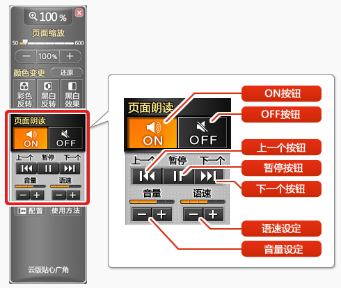 点击“OFF”按钮,即可关闭页面朗读。朗读用详细面板同时也会自动关闭。